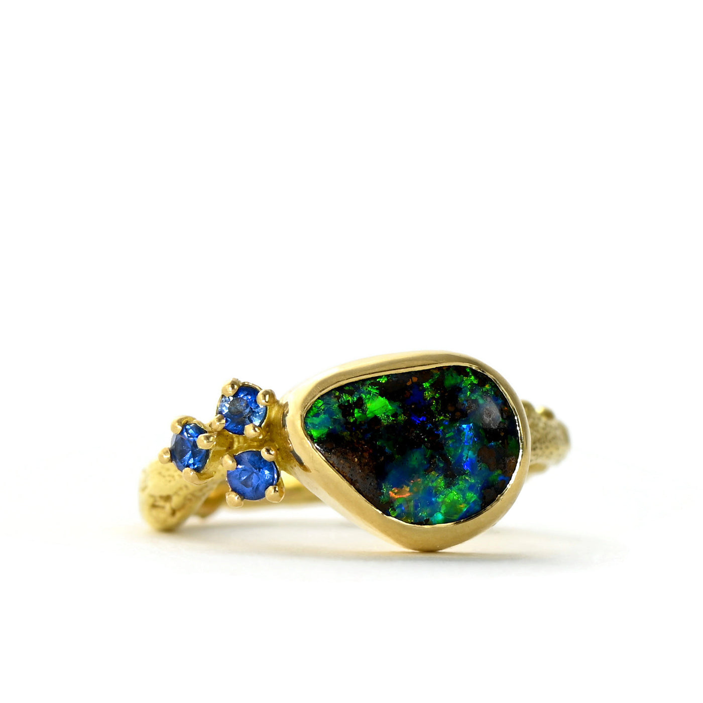 Inspired by pre-Colombian jewellery and the delicate, natural texture of tropical insects. The design features a beautiful bright, clear and great colour Colombian emerald set in a textured 18ct Fairtrade yellow gold...